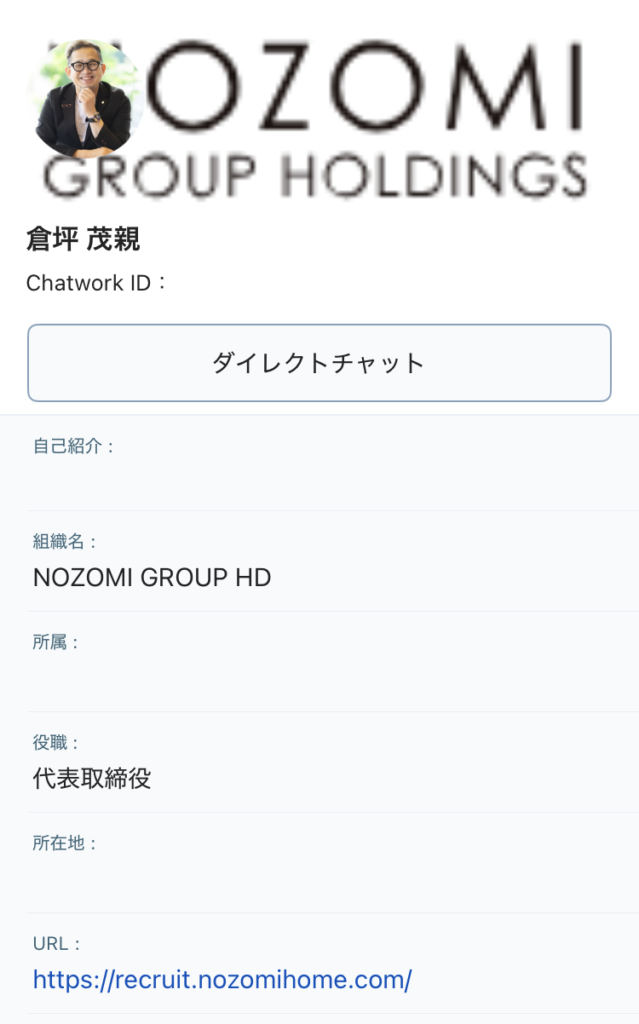 現在、ビジネスチャット「Chatwork」上で当社代表者(株式会社 望みグループホールディングス 代表取締役 倉坪茂親)を装い、コンタクト申請を求める事案を確認しております。